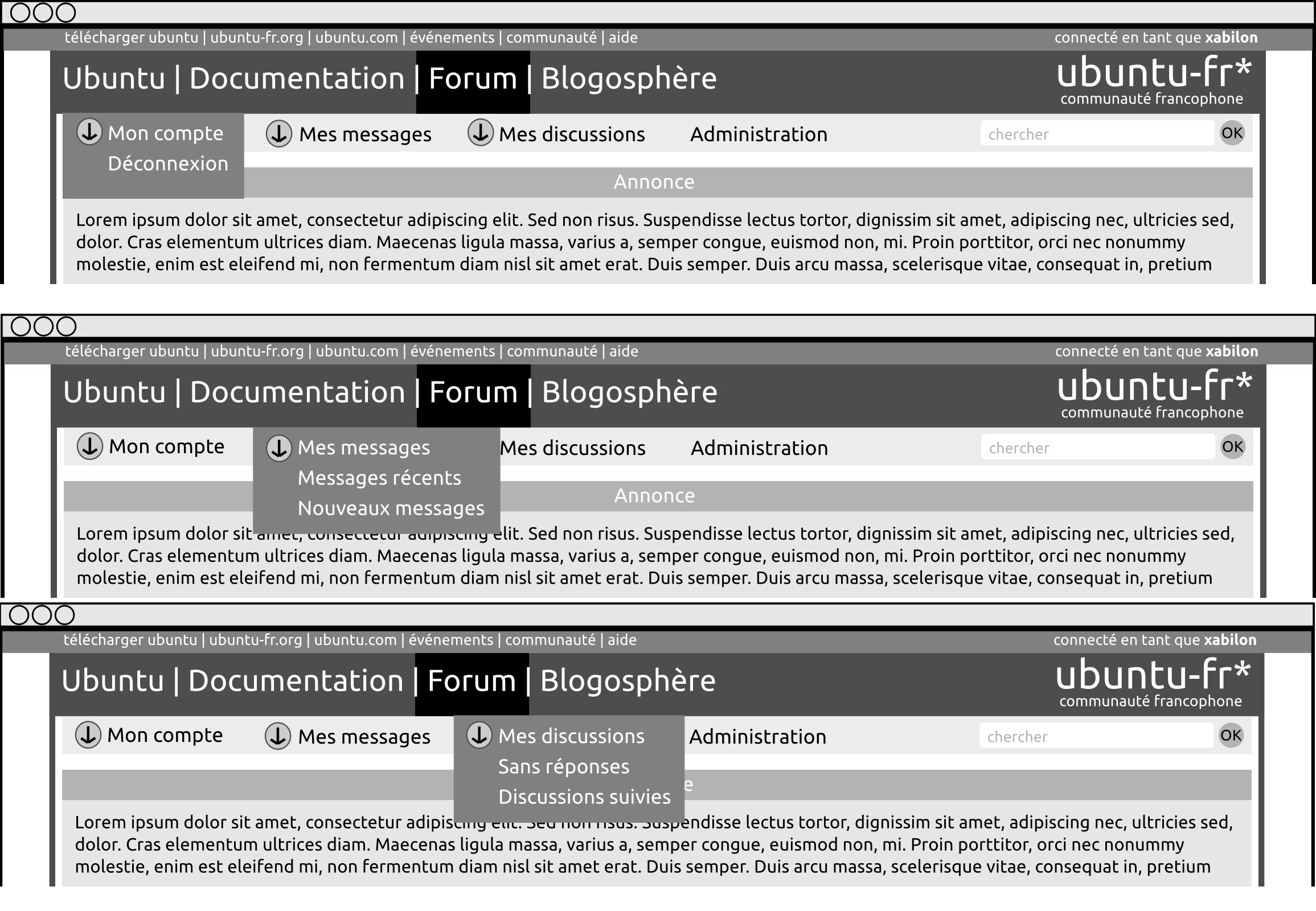 En haut de tous nos outils une barre unique et identique permettra de faire un lien entre tous les domaines existants dans notre communauté (ubuntu-fr, ubuntu-party, documentation, forum, planet, …). On peut également y mettre le lien de connexion sur le site actuel, ou tout autre élément utile à tous les sites. Le contenu de cette barre n'étant pas défini, vous pouvez proposer des contenus types qui vous semblent pertinents.