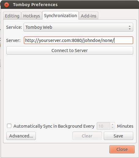 Cliquer sur Se connecter au serveur. une page web s'ouvre vous demandant identifiant et mot de passe. Apres vous être connecté vous pouvez fermer le navigateur et commencer la première synchronisation avec Tomboy