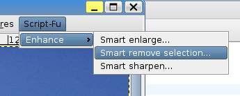 puis sur le calque, faites un clic droit, suivi de "Alpha vers sélection". Sélectionnez le calque avec votre photo, puis rendez vous dans le menu Script Fu > Enhance > Smart remove selection.
