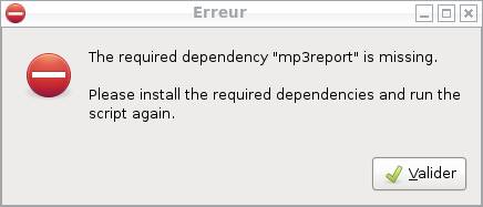 - Le script commence par vérifier les dépendances (zenity et mp3report). Si au moins l'une d'elles manque, il affiche une fenêtre d'erreur et s'arrête.
