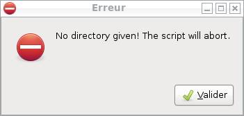 #!/bin/bash ################################################################ # Displays a directories selection box to choose the scanned # # directories. # # - Multiple selection is allowed # # - The subdirectories are included too # # # # Auteur : kamui57 < kamui_57 AT yahoo DOT fr > # # # # Licence : Ce script est un logiciel libre ; vous pouvez le # # redistribuer et/ou le modifier selon les termes de la # # Licence Publique Générale GNU ( GNU GPL ) publiée par la Free# # Software Foundation. # # # ################################################################ zenity --info \ --text="Please choose now the directories to scan. The subdirectories will be included." directoriesInput=$(zenity --file-selection --directory --multiple --separator=$separator); if [ "$directoriesInput" = "" ] then zenity --error --text "No directory given! The script will abort." exit fi