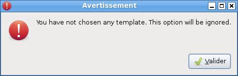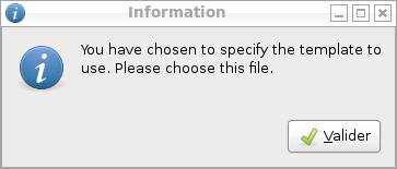 - Si l'on a choisi l'option "template", qui nécessite l'entrée du fichier template, une boîte de dialogue s'affiche nous prévenant que l'on va devoir le choisir.