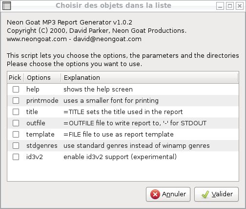 Ce script a pour but de donner une interface graphique à mp3report. Il est composé de plusieurs fichiers :